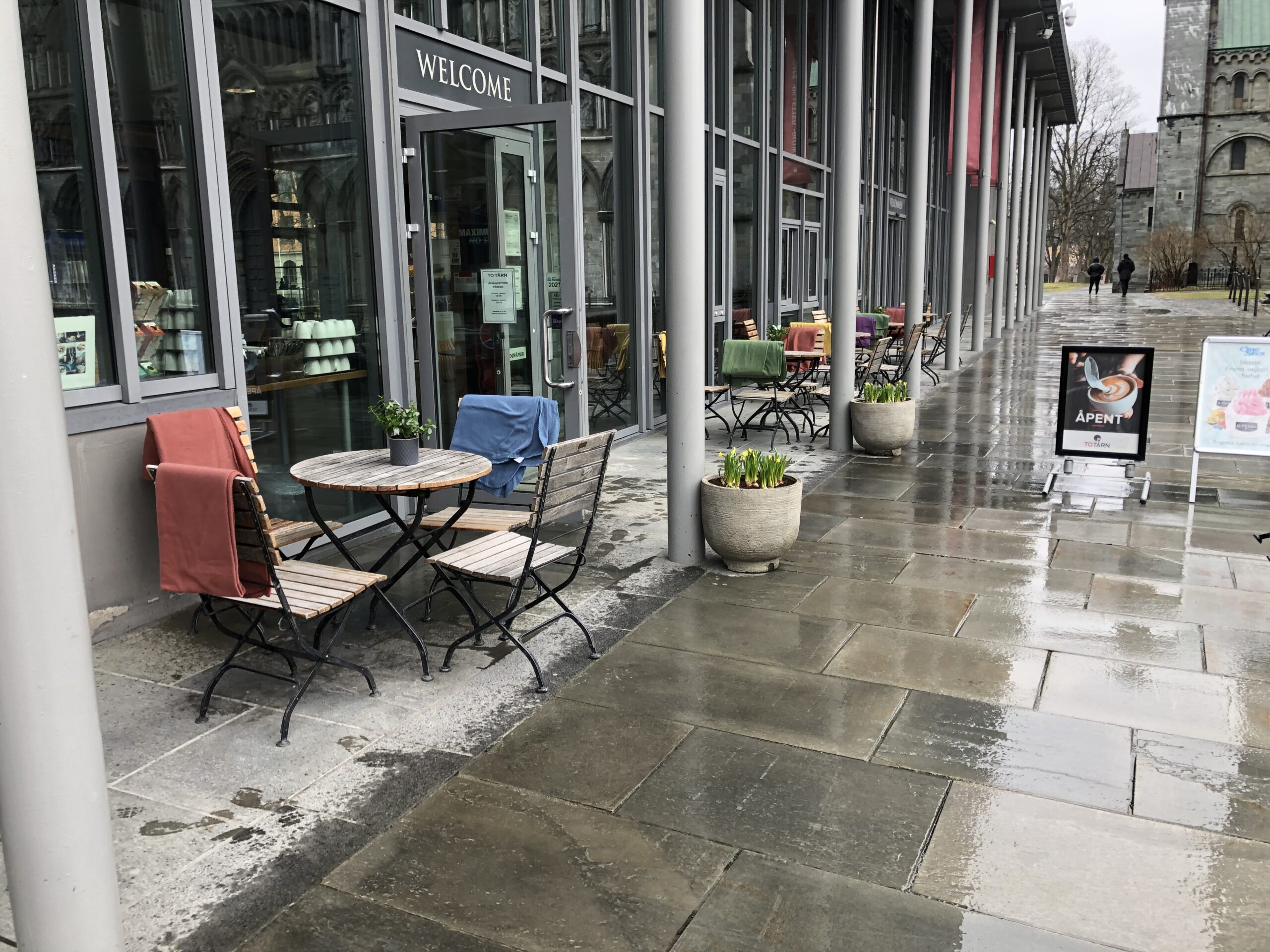 Med panoramautsikt mot Vestfronten av Nidarosdomen kan du nyte oppsmurte snitter – «Bondens rugbrød», lekre laks- og rekesmørbrød, baguetter og ciabatta – «Steinhuggerbrød» med assortert pålegg, samt vår «Pilegrimsuppe» med storfekjøtt og rotgrønnsaker.